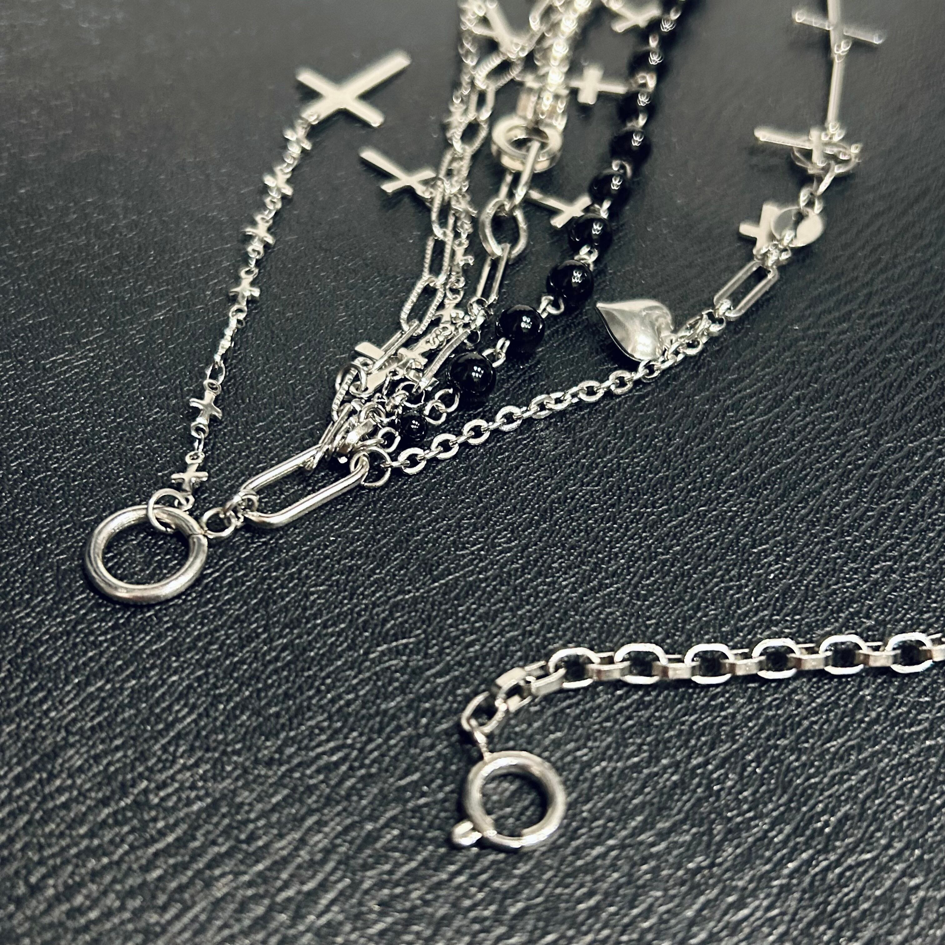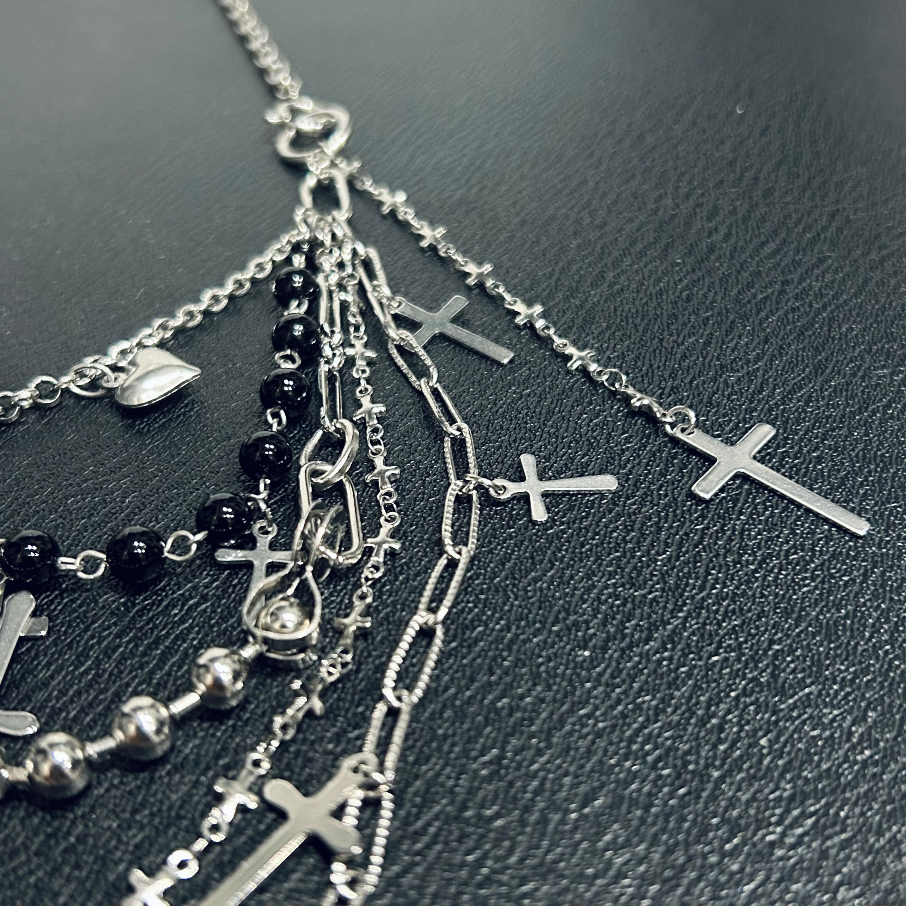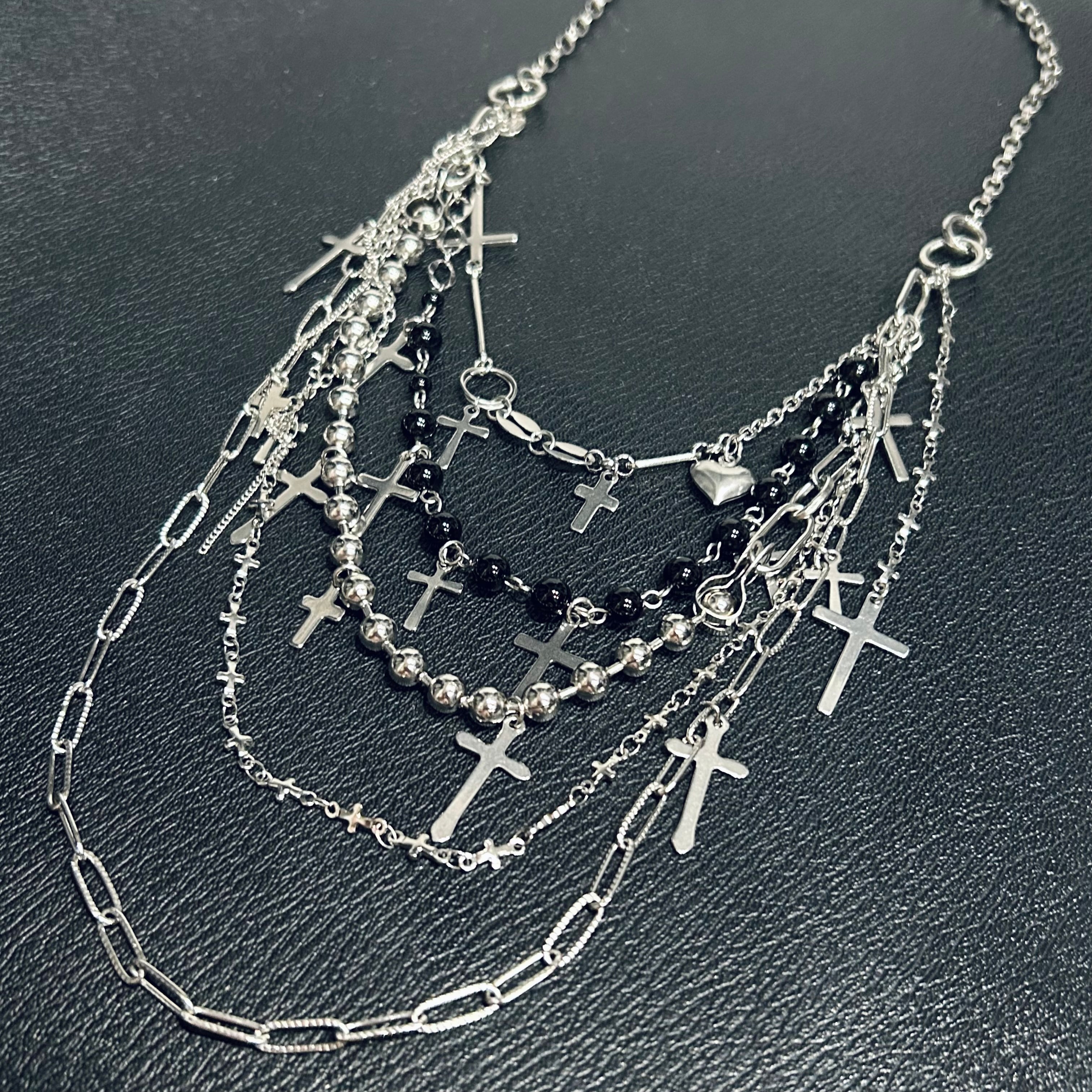 多重チェーンとクロスパーツをふんだんに使用した豪華な仕上がりのネックレス。こちらは一点物になります。